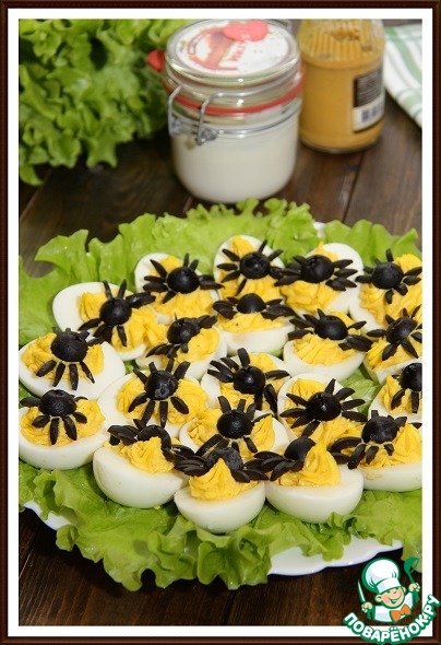 Переложить массу в мешочек с насадкой и наполнить ею половинки яиц. Украсить паучками из оливок. Для этого у оливки срезать верхушку, а остальную часть порезать тонко, это будут лапки. В центр яйца положить "пуговку" оливки и воткнуть по бокам лапки. Подавать на блюде застеленном листьями салата.