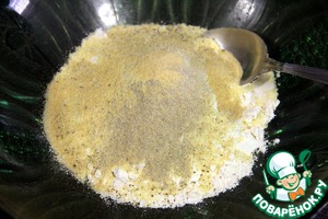В отдельной посуде смешать кукурузную и белую муку, перец, чеснок и соль.