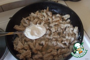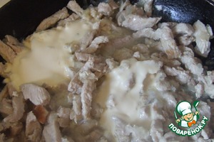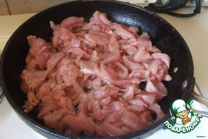 В сковороду наливаем растительное масло, даем ему разогреться и только тогда выкладываем мясо. Закрываем крышкой и жарим до готовности (можно добавить немного водички).