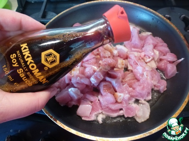 Обжарить на растительном масле, добавить соевый соус, соль не добавлять, соевый соус достаточно соленый.