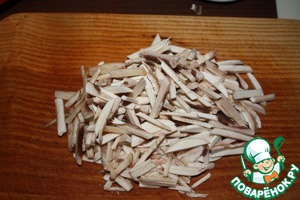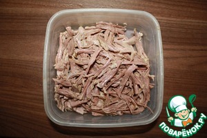 Мясо должно быть очень хорошо проваренным. Его можно порвать по волокнам или нарезать длинными палочками