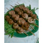 Лук мелко шинкуем и ставим обжариваться в небольшой количестве оливкового масла. Зелень мелко шинкуем, маслины режем колечками. Замаринованое мясо выкладываем на фольгу