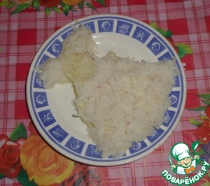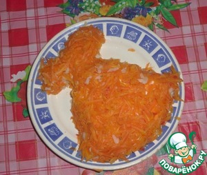 Картофель натереть на крупной терке, выкладываем в форме платья.