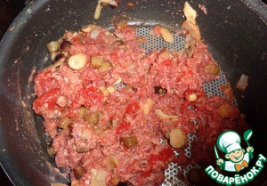 Добавить к обжаренным овощам фарш и часть томатов. Слегка потушить.