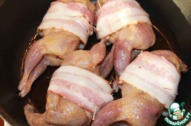 Завернуть перепелок в пластики бекона. Он не даст пересохнуть перепелиным грудкам, и мяско останется очень нежным