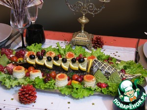 Честно говоря, из всех этих ингредиентов, кроме рыбы, было съедено немного: икра, маслины, несколько помидорок черри. Особенно гости зауважали зерна граната. Мы уже 20 лет живем во Франции, и гости были французы, здесь не очень распрастранен этот замечательный и полезный фрукт. После того, как мы объянили, какие уникальные свойства хранит гранат, да ещё рассказали, что на Кавказе парень признается девушке в любви, подарив ей 7 гранатов, все зерна с блюда смели.