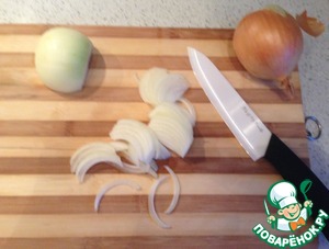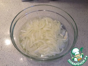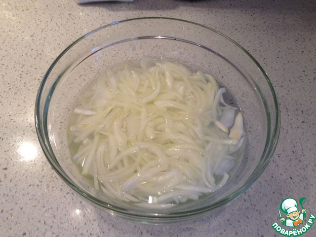 И замочить в холодной воде. В воду я положила несколько кубиков льда (китайцы часто замачивают нарезанные овощи). В данном случае лук станет более сочным и отдаст лишнюю горечь.