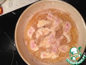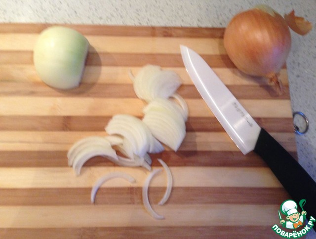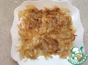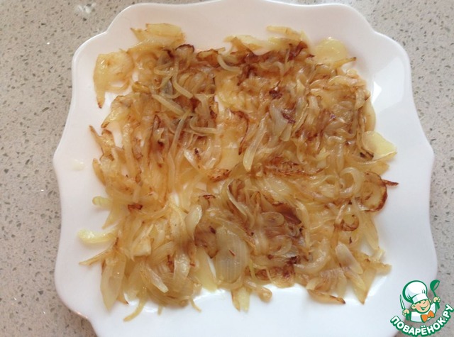 На другой сковороде на растительном масле обжарить наш вымоченный лук до золотистого цвета.