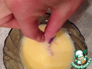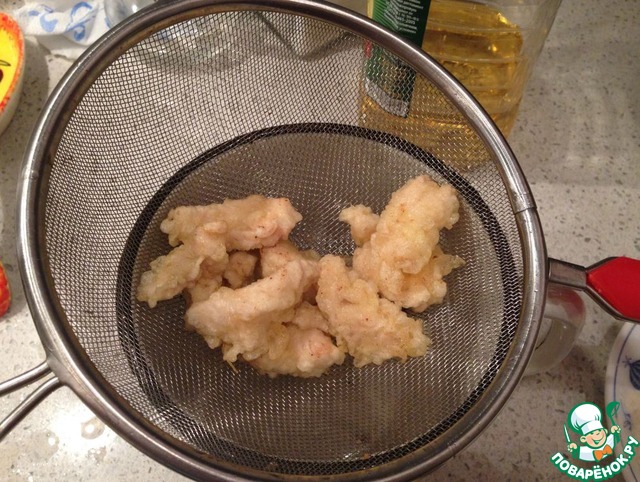 Сделать кляр: яйцо смешать с крахмалом, если смесь получается густая, то можно разбавить холодной водой до консистенции теста для блинов. Каждый кусочек обмакнуть в кляр.