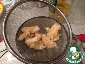 Обжарить в разогретом растительном масле до образования золотистой корочки. Сильно зажаривать не надо, кусочки должны получиться воздушными.