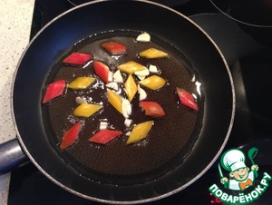 На сковороде разогреть растительное масло (1 ст. л.) и немного обжарить крупно нарезанный чеснок и болгарский перец. В Китае повара для горячих блюд режут овощи ромбиком.