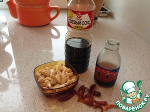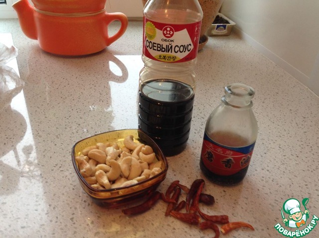 В разогретый соус выложить курицу, добавить орешки кешью, соевый соус (главное, с ним не переборщить, если используете покупной Хой Син) и кунжутное масло ( у меня "родное" китайское). Добавить по вкусу мелко нарезанный перец чили, я использовала мелкий домашний перчик, не знаю его названия - очень жгучий.