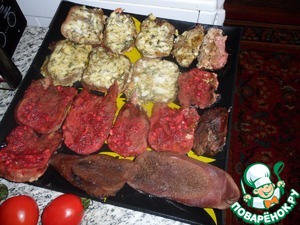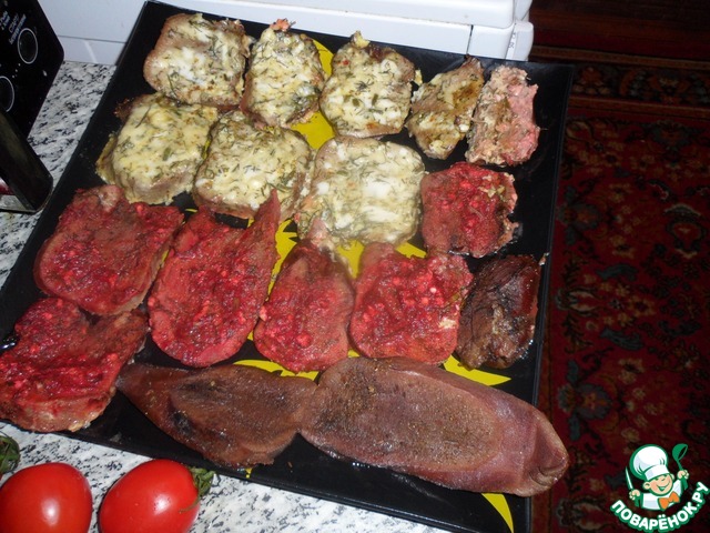Подготовить противень, смазать маслом, разогреть духовку до 180 градусов. Я на противень для мяса всегда грамм 50 вина лью, чтобы мяско было сочным. Посыпаем каждый кусок языка смесью перчиков и соли. Обмакиваем в один из соусов и выкладываем на противень.