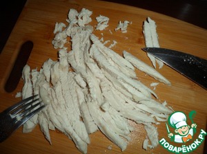 Охлажденную отварную грудку нарезаем соломкой и отправляем к остальным ингредиентам