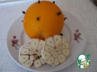 Крупный апельсин (если индейка большая, то можно и парочку, у меня была 4,5 кг индейка и апельсин размером с мужской кулак, было впритык). Итак, апельсин кидаем в кипящую воду и варим не более 2 минут. Вынимаем и втыкаем в него гвоздику, 7 шт на 5 кг индейку для аромата достаточно. Чеснок разрезаем пополам и всё это чудо укладываем в индейку. Сначала одну половинку чеснока в самую глубь, затем апельсин и второй половинкой затыкаем окончательно )))