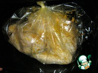 Зашиваем отверстие подходящими нитками или закрепляем деревянными зубочистками. Индейку можно запекать в фольге, для этого оторвите длинные куски фольги, застелите ими противень так, чтобы концы свисали и ими можно было бы достаточно свободно завернуть индейку. Или выпекать в пакете для выпекания (я использовала этот метод). для этого наполните пакет воздухом, чтобы он не прилипал к индейке. Верхний угол пакета аккуратно обрежьте наискось, чтобы получилось отверстие около 1-2 см. Через него во время приготовления будет выходить лишний пар - тогда индейка будет подрумяниваться и запекаться от воздействия горячего воздуха, а не тушиться.