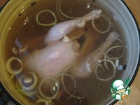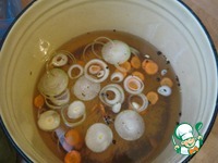 Для того, чтоб наша индейка была сочной и нежной, её надо вымочить в солевом растворе, как минимум, сутки. Готовится раствор легко. Сахар и соль заливаем 1 литром кипятка, полностью растворяем кристаллики. Лук нарезаем крупными кольцами, морковь кружками, кидаем лавровый лист и палочку корицы (разламываем её). Добавляем кориандр и перец душистый горошком.