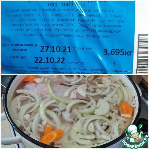Я делал в большой кастрюле и залил ещё одним литром холодной воды. Индейка 4,5 кг.