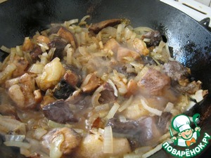 Половину репчатого лука режем кубиками и обжариваем в небольшом количестве растительного масла. Грибы желательно использовать свежие или замороженные лесные грибы, смесь грибов, крупно нарезанных. Всё обжариваем на среднем огне до мягкости лука (если грибы свежие, то предварительно отварить, слить воду)