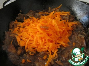 Морковь натираем на крупной тёрке, добавляем к грибам.