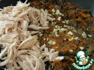 Отварную грудку курицы разбираем на волокна. Можно добавить в салат так, а можно, следуя рецепту, добавить к обжаренным грибам, так же можно выдавить через пресс или мелко порубить дольку чеснока (на любителя). Потушить всё вместе около 2-3 минут. Остудить.