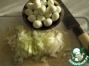 Вторую половинку лука мелко шинкуем кубиком. Перепелиные яйца отвариваем, очищаем (у меня много, так как я использовала яйца и для украшения салата, да и полезней они куриных... конечно в разумных количествах), на салат в среднем уходит от 10 до 20 шт, по вашему вкусу и предпочтениям. Можно, но не рекомендуется (вкус уже будет не тот) заменить перепелиные яйца куриными: 3 перепелиных =1 куриное (крупное)