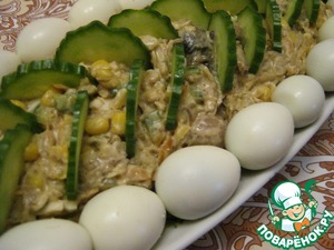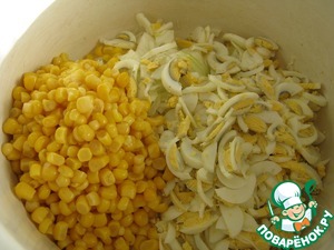 Яйца нарезаем полукольцами, добавляем лук, консервированные шампиньоны (мелкие целые или порезанные большие, иногда шампиньоны заменяются консервированными опятами).
