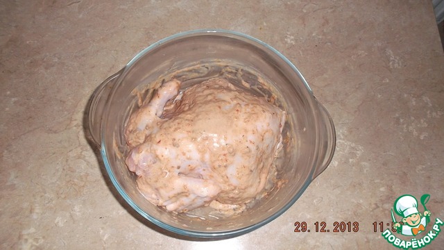 Смешать соус и сметану. Курицу промыть, обсушить и обмазать смесью и солью. Дать ей промариноваться часа 4 или лучше ночь. Затем ставим ее в духовку, накрыв форму крышкой, на 1 час, при температуре 180-200 градусов. Через час крышку снять и запекать еще 30 мин., чтобы подрумянилась.