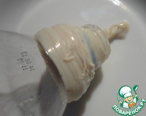 Идеально наполнять кишки с помощью колбасной насадки на мясорубку. У меня, увы, нет этого девайса. Поэтому пользуюсь горлышком от пластиковой бутылки. Надеваю на него край кишки, фиксирую ниткой.
