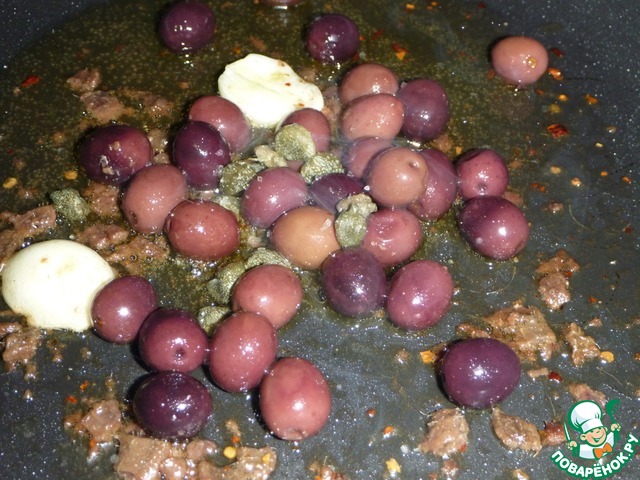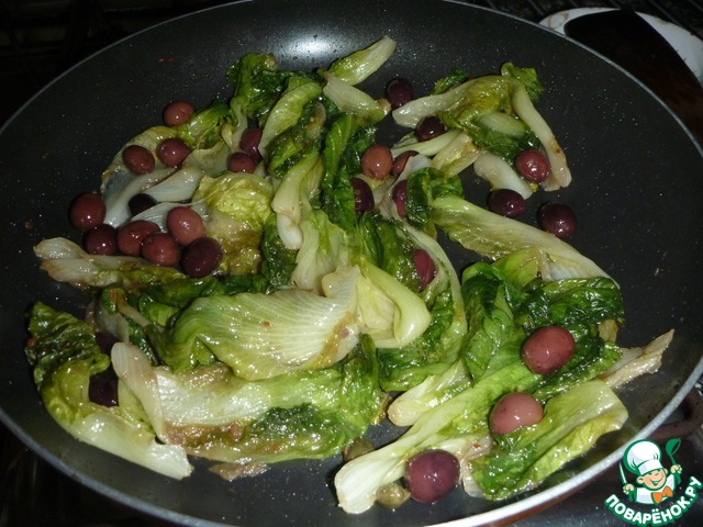 И можно сразу же добавить скаролу. Накрываем крышкой, готовим до мягкости. Примерно 15-20 мин. На последних минутах желательно открыть крышку для испарения лишней жидкости. Это блюдо не солим, т. к анчоусы, каперсы и оливки достаточно соленые.
