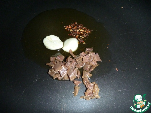 И отправляем на сковороду вместе с оливковым маслом и чесноком, на медленном огне припускаем около 1 минуты.