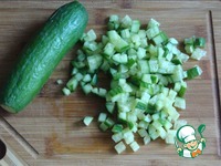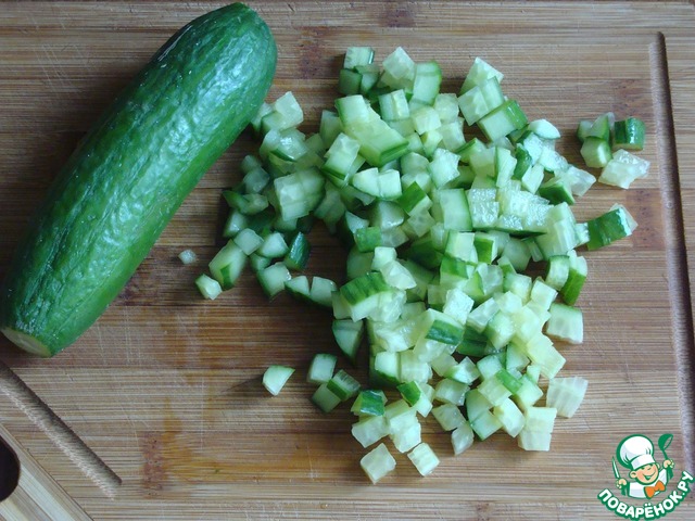 Все делается просто и быстро, как на салат "Оливье". Все нарезаем кубиками. Нарезаем два небольших огурца |