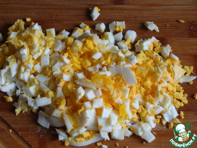 Четыре небольших отварных картофеля очищаем от кожуры и нарезаем кубиками