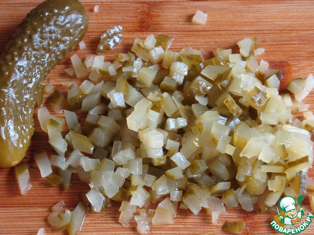 Следом шинкуем на кубики соленые огурчики - 2 шт. |