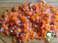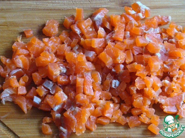 Малосольную красную рыбку тоже нарезаем кубиками. Рыбку можно взять любую по вашему желанию - лосось, семгу, форель и т. д. |