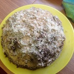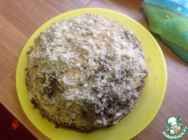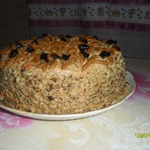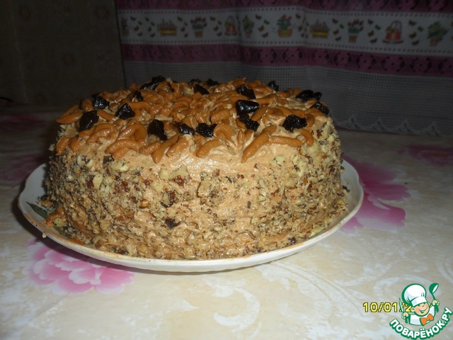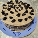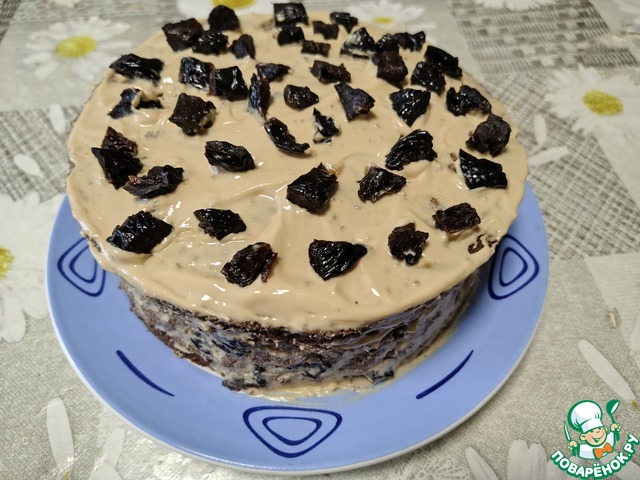 Собираем торт: на блюдо выкладываем корж, смазываем его кремом, на него бисквитные кубики с кремом, перекладываем черносливом. Выложить верхний корж, смазать оставшимся кремом. Украсить черносливом и орехами. Все. Торт готов.