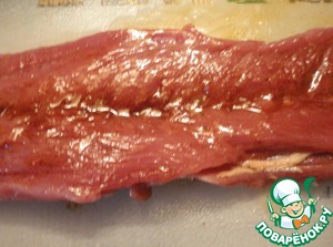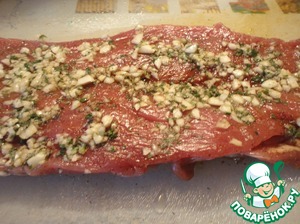 Намазываем чесночно-пряной смесью вырезку с внутреней стороны.