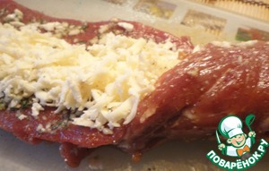 Выкладываем сырную смесь на вырезку с одного края, оставляя примерно 1-1,5 см с другого края.