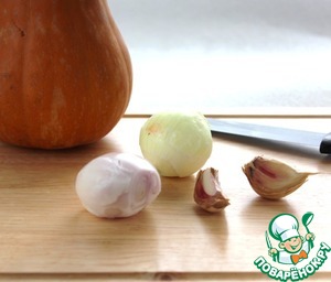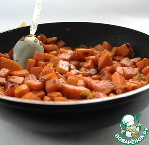 Обжарить лук в сковороде с разогретым оливковым маслом. Добавить тыкву, чеснок и карри, обжарить на сильном огне до золотистой корочки 5 мин.