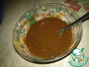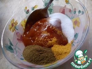 Специи смешать в однородную массу. По рецепту идет просто томатная паста, у меня пасты не оказалось, я использовала кетчуп. Было очень вкусно!