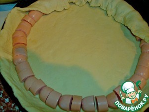 Поверх капусты обильно посыпаем тертым сыром и надрезаем тесто между кусочками сосисок острым ножом… Если готовите со слоеного теста, то после выпечки получается очень красиво…