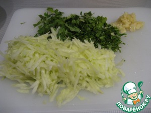 Мелко порубить зелень, измельчить чеснок, яблоки натереть на крупной терке