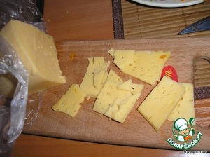 Режем сыр на маленькие квадратики.