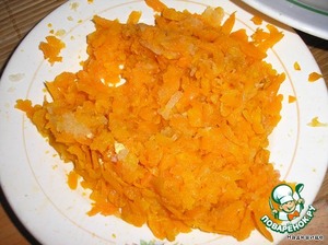 Отвариваем морковочку и трем ее на крупной терке. Туда же трем одну луковицу.