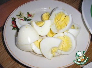 Отвариваем яйца вкрутую и режем их на четыре дольки.