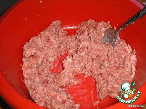 Берем свиной фарш, добавляем одно яйцо, приправляем специями, солим, тщательно перемешиваем.
