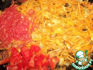 Морковь натереть на крупной тёрке, лук мелко порезать, переложить всё в сковороду, добавить растительное масло и обжарить до золотистого цвета. Болгарский перец порезать на кубики, помидор натереть на тёрке, добавить к моркови с луком, тушить в течение 5 минут.