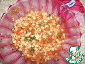 Чеснок измельчить, кинзу, укроп, петрушку порезать мелко, соединить с содержимым сковороды добавить соль и перец. Перемешать с фасолью.