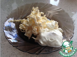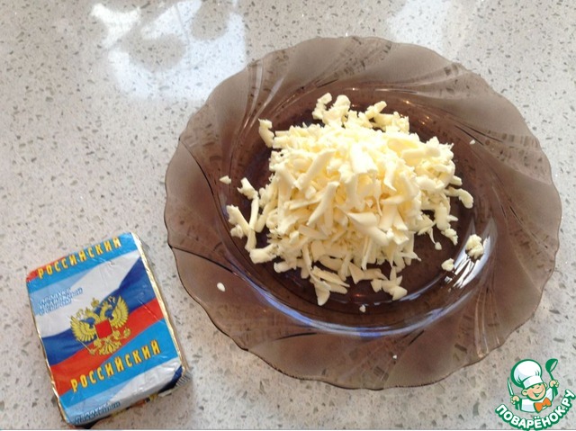 На крупной терке натереть плавленые сырки (перепробовала несколько видов, "Российский" - ближе всех к оригиналу),