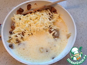 В остывшие грибы и лук добавить натертый сыр и яйца. На этом этапе можно добавить мелко нарубленную зелень (петрушку, укроп и т. п. - кому что нравится). Мой муж предпочитает данный пирог вообще без добавок, поэтому я пропустила этот шаг. Размешать.